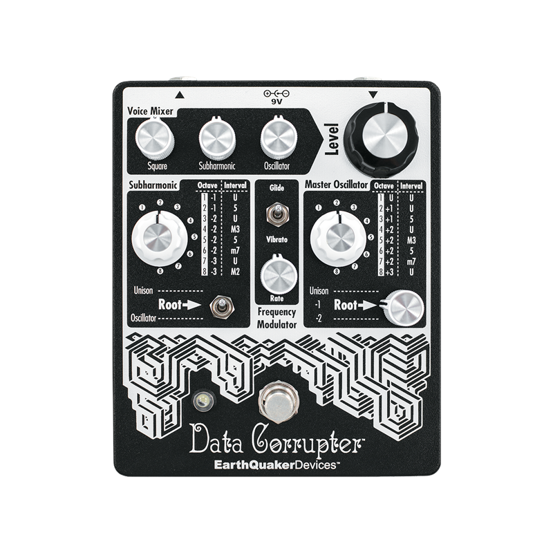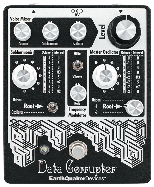 Le Data Corrupter est un harmoniseur PLL (Phase-Locked Loop pour boucle à phase asservie) monophonique modulé à 3 voix qui prend votre signal en entrée et l’amplifie brutalement pour obtenir un gros son de fuzz à onde carrée qui est alors multiplié, divisé et modulé" pour créer un son de synthé analogique harmoniquement complexe, expressif et sensible au toucher, jusqu’à 3 octaves en-dessous ou au-dessus du signal d’origine, ainsi que des harmonies supplémentaires. La voix Master Oscillator va jusqu'au 3 octaves supérieures et différents intervalles grâce à l’un de ses 8 programmes. La voix Subharmonic procède elle jusqu'à 3 octaves inférieures et d'autres intervalles définis par l'un de ses 8 autres programmes. La section Frequency Modulator applique une modulation de type pitch-bend à l’oscillateur maître, en mode Glide vous entendrez un léger portamento entre chaque note, en mode Vibrato le pitch module vers le haut et le bas pour un effet retro de science-fiction. La 3ème voix est une fuzz à onde carrée et les 3 voix peuvent être mixées via la section Voice Mixer."