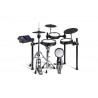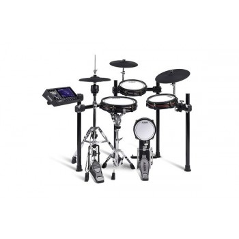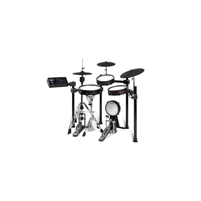 Composants : Comprend cinq pads en caoutchouc ultra-résistants (caisse claire, trois toms, grosse caisse), trois cymbales (charleston, crash, ride) et un module sonore avancé.