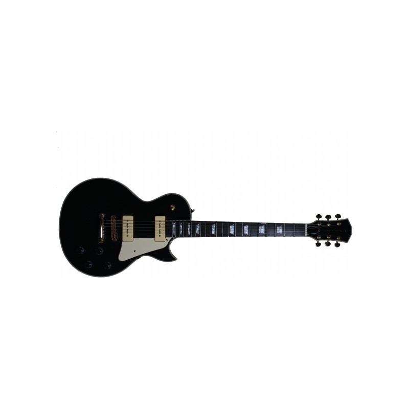 L7V BK Corps en Acajou/érable massif et veines flamées, Format: Lespaul, manche acajou, forme en C, diapason: 24'7”, touche en ébene (Radius : 12"), Frets: 2,7 medium Jumbo, sillet: 43mm, Binding : ivoire , Incrustations nacrées, Capteurs 2 micros P90, Contrôles : 2 Volumes, 2 Tonalités (Chaque micro) selecteur 3 positions, Chevalet : Tune-O-matic & cordier en aluminium, Mécanique: Capot haute qualité (Chrome), Pickguard : ivoire, Finition Noir