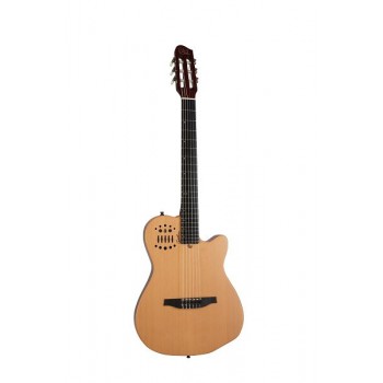 L’ACS-SA allie les caracteristiques des guitares classiques à celles des guitares Solid Body. Dotee d’un manche incroyablement confortable et d’une caisse en erable avec un table en cedre massif, la Mutliac ACS constitue notre modele nylon d’entree de gamme equipee à fonction acces synthe MIDI. Bien que la caisse soit munie de chambres acoustiques, l’epaisse table d’harmonie en erable utilisee se rapproche davantage des modeles Solid Body, plutot que des instruments de type traditionnel. Cette conception a engendre un instrument pratiquement exempt de tout risque de Larsen, le rendant ainsi davantage utilisable sur scene. L’ACS est equipee de capteurs individuels associes à un preamplificateur specialement conçu par RMC. Non seulement ce systeme produit un superbe son amplifie, mais il est dote d’une sortie hexaphonique et d’une prise 13 broches permettant un acces direct aux synthetiseurs de guitares de la Serie GR de Roland. Manche Acajou Radius 16'', Diapason 64.77cm, Touche Richlite 22 frets, Sillet Graphtech 48,2mm, Mecanique 16:1, jeu de cordes HTC Nylon (.0285,>.0327,.0410,.030,.036,.044), Finition Naturel Semi-gloss, livree en housse