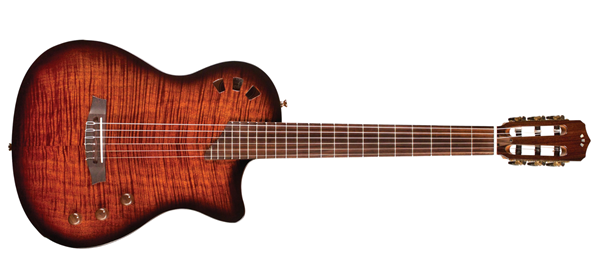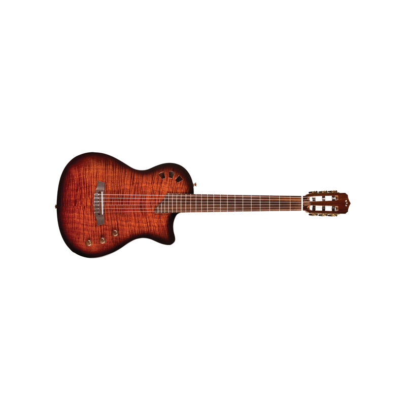 Guitare de scène Solid Body Chambrée. Une révolution dans la conception de la guitare nylon, des années de fabrication. La Stage est doté d'une table en épicéa massif coiffée d'un fin placage d'érable flammé et d'un motif de contreventement en épicéa conçu sur mesure. La nouvelle forme de corps ergonomique est sculptée dans de l'acajou massif, conservant un caractère acoustique riche et permettant une épaisseur de corps de seulement 40 mm adaptée à la scène. Le manche de la CORDOBA Stage ayant une touche d'un rayon de 16 " et une largeur de sillet de 48 mm, offre une expérience de jeu confortable et rapide pour tout type de joueur. Une table Edge Burst douce et une finition en polyuréthane brillant confèrent au caractère visuel saisissant de la guitare. Le tout nouveau système Fishman exclusif utilise un système de micro à 3 points combiné à trois commandes : Volume, Bass Response et Blend. Permettant une grande variété de sons acoustiques naturels à n'importe quel volume.La guitare de scène Córdoba est livrée avec un sac de transport sur mesure et prêt pour le voyage. Conçu avec une esthétique utilitaire vintage à l'esprit. Le nylon recyclé de couleur marine offre une toile de fond pour les nombreuses poches conçues pour transporter votre accordeur, vos câbles, votre préampli, vos partitions et tout ce dont vous avez besoin. Les fonctionnalités supplémentaires incluent un système de bandoulière pour un port de style sac à dos et une sangle avant pour faciliter le transport.