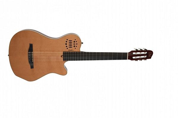 La Multiac Grand Concert est une guitare conçue pour les instrumentistes à l’affût d’une guitare au caractere plus classique. La caisse est legerement plus large et arbore une superbe table d’harmonie en cedre massif et un manche fixe au corps au niveau de la douzieme frette. La largeur de manche de 50,8 mm au talon reste dans la tradition la plus classique. Il en resulte l’instrument ideal des guitaristes classiques qui recherchent un son amplifie parfait. Table en cedre massif, Caisse double-chambree acajou, manche acajou radius 24’’, Touche Richlite 19 frets, Diapason 65.17cm, Sillet Graphtech, mecanique 16:1, preampli RMC avec synth-acces (Roland GR), Finition naturel High gloss, Cordes nylon HTC (.0285,.0327,.0410,.030,.036,.044) livree en housse.