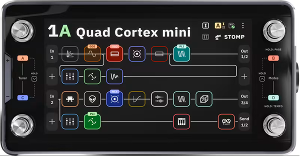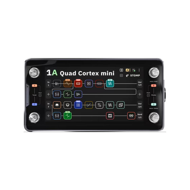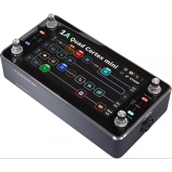 NEURAL DSP Quad Cortex Mini L'essentiel à savoir sur le multi-effets Neural DSP Quad Cortex mini Un vrai rig pro (multi-effets guitare et basse, modélisation et capture) dans un format ultra-compact, idéal pour pedalboard, fly rig, rack et studio. Neural Capture V1 et V2 pour emporter vos amplis, baffles et pédales capturés, avec accès au Cortex Cloud via Wi-Fi. Écran tactile 7 pouces + 4 footswitches rotatifs avec Focus, Pages et Gig View pour une navigation rapide et une lecture claire sur scène. Interface audio USB-C 16 canaux et routage en grille avec jusqu'à 4 chemins parallèles pour les setups stéréo, wet/dry et multi-amplis. Du Quad Cortex au format mini : l'ADN Neural DSP, en version pedalboard Le Quad Cortex mini reprend l'approche qui a fait la réputation de Neural DSP : une plateforme pensée comme un centre de contrôle unique pour votre son, capable de remplacer une chaîne d'ampli complète, un pedalboard chargé et une interface audio. Tout l'esprit du Quad Cortex est là, mais dans un châssis réduit (gain de place considérable sur un pedalboard) sans renoncer à l'édition tactile, à la puissance de calcul, ni à l'écosystème CorOS. Résultat : un multi-effets premium qui s'intègre aussi bien dans un setup minimaliste que dans un système de tournée moderne. Pour quels musiciens et quels usages ? Conçu pour les guitaristes et bassistes du niveau intermédiaire au professionnel, le Quad Cortex mini brille en live (changements de sons rapides, lisibilité, routage flexible), en studio (DI, reamp, enregistrements multipistes via USB) et pour la création de contenu. Blues, rock, metal, funk, pop, worship ou ambient : il passe d'un clean large et défini à des saturations modernes très serrées, tout en gardant une sensation de jeu naturelle. Si vous aimez préparer des sons par titre, gérer des variations par section et voyager léger sans compromis, son workflow orienté performance devient vite indispensable. Contrôles, modes et intégration : un workflow pensé pour la scène Au coeur de l'expérience, l'écran multi-touch 7 pouces accélère la création de presets et le câblage virtuel en grille, tandis que les 4 footswitches rotatifs transforment l'édition en geste immédiat. Le Focus system permet d'attraper des paramètres clés sans plonger dans les menus, et le concept Pages multiplie les commandes accessibles au pied pour piloter plus de fonctions dans un encombrement minimal. En live, Gig View améliore le contraste et la lisibilité pour enchaîner les morceaux sereinement. Côté intégration, vous bénéficiez du MIDI TRS Type A, du MIDI over USB, du Wi-Fi pour la gestion des contenus et des mises à jour, et de l'application Cortex Control pour éditer, sauvegarder et organiser vos banques de sons. La sonorité Le Quad Cortex mini se distingue par une sensation de jeu très directe : attaque franche, dynamique respectée, et une réponse qui suit la main droite (ou le jeu au médiator) avec précision. En clean, on obtient un rendu hi-fi, ample et tridimensionnel, parfait pour les chorus, delays et réverbs modernes. En saturation, la définition reste solide même sur les accords complexes, avec une réserve de gain adaptée aux styles contemporains. Les IR de baffles et surtout les Neural Captures permettent de retrouver le grain d'un ampli ou d'une pédale avec une cohérence impressionnante, et le routage parallèle aide à construire des sons stéréo (wet/dry, double ampli, couches d'ambient) sans brouiller le mix. Des artistes reconnus ont déjà intégré le Quad Cortex dans leurs rigs, preuve de la crédibilité de la plateforme sur les plus grandes scènes comme en studio. Caractéristiques techniques Moteur sonore, librairies et création de sons Type : processeur multi-effets et modéliseur/profiler guitare et basse avec technologie de capture Plateforme : technologie Neural Capture et environnement CorOS Bibliothèque préchargée : 90+ amplis, 100+ effets, 1000+ IR de baffles, 2000+ Neural Captures Neural Capture : compatibilité Neural Capture V1 et V2 (amplis, baffles, overdrives, fuzz, compresseurs) Cortex Cloud : accès aux contenus partagés par la communauté via Wi-Fi Chaîne de signal : grille complète avec contrôle tactile et au pied Routage avancé : jusqu'à 4 chemins parallèles, routage flexible, jusqu'à 8 blocs par rangée Workflow live : modes, Pages et contrôle Modes : Preset, Scene, Stomp et Hybrid (assignation flexible par rangée) Pages : contrôle étendu (Page 1 / Page 2) sans augmenter l'encombrement Gig View : affichage haute lisibilité orienté performance Opposite Page Preview : visualisation instantanée des assignations de l'autre Page Focus system : réglage rapide des paramètres via les footswitches rotatifs Fonctions utiles : Fast Mute (double tap volume), accordeur, métronome Looper : Looper X avec fonctions avancées Écran, commandes et interface utilisateur Écran : 7 pouces, haute luminosité, multi-touch Commandes : 4 encodeurs/footswitches rotatifs en acier inoxydable (Preset, Scene, Stomp + édition) Édition : navigation rapide et réglages immédiats via tactile + contrôles physiques Audio USB, connectivité et compatibilités Interface audio : USB-C, 16 canaux (8 entrées / 8 sorties), USB Audio Class 2.0 Fréquence d'échantillonnage : 48 kHz (fixe) Applications : Cortex Control (édition, sauvegardes, gestion de contenus) Wi-Fi : téléchargements, mises à jour firmware, sauvegardes Plugins : compatibilité avec des plugins Neural DSP supportés Écosystème : CorOS, presets et sauvegardes transférables entre Quad Cortex mini et Quad Cortex Entrées, sorties et contrôle (I/O) Entrées : 1 x jack 6.35mm asymétrique (Input 1), 1 x combo XLR + jack 6.35mm (Input 2 / Capture Input, ground lift), 1 x jack 6.35mm TRS (Return 1/2 via câble insert) Sorties : 2 x XLR (Outputs 1/2, ground lift), 2 x jack 6.35mm asymétrique (Outputs 3/4), 1 x jack 6.35mm TRS (Send 1/2 via 