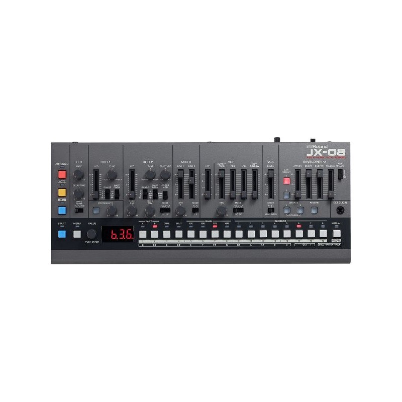 User MemorySound Patch: 256Pattern: 128ControllersRear PanelPower switchVOLUME knobLFO SectionRATE knobDELAY TIME knobWAVE FORM switchDCO-1 SectionLFO sliderTUNE knobRANGE switchWAVE FORM switchDCO-2 SectionLFO sliderTUNE knobFINE TUNE knobRANGE switchWAVE FORM switchCROSS MOD knobDCO-1 ENV knobDCO-2 ENV knobMODE switchMIXER SectionDCO-1 sliderDCO-2 sliderENV knobMODE switchVCF SectionHPF sliderCUTOFF FREQ sliderRES sliderLFO sliderKEY FOLLOW sliderENV knobMODE switchVCA SectionLEVEL sliderMODE switchENVELOPE-1/2 SectionENV SELECT 1, 2 buttonsATTACK sliderDECAY sliderSUSTAIN sliderRELEASE sliderKEY FOLLOW switchPORTAMENTO SectionMODE buttonTIME knobEFFECT SectionCHORUS 1, 2 buttonsREVERB buttonARPEGGIO buttonNOTE buttonSEQ buttonSTART buttonMENU buttonVALUE knobPART A, B buttonsDUAL buttonSPLIT buttonBANK 1(5)--4(8) buttonsNUMBER 1--8 buttonsMANUAL buttonEffectsChorus: 3Delay: 4OverdriveFUZZDriveBit crusherLOFI CompPhaser: 2FilterPitch Shifter: 2Step Sequencer64 steps4 notes (Polyphonic)Display7 segments, 4 characters (LED)ConnectorsEXT CLOCK IN jack: Mono miniature phone typePHONES jack: Stereo miniature phone typeOUTPUT jack: Stereo miniature phone typeMIX IN jack: Stereo miniature phone typeMIDI (IN, OUT) connectorsUSB port: USB Type-C(R) (Audio, MIDI)Power SupplyNi-MH battery (AA, HR6) x 4 or Alkaline battery (AA, LR6) x 4USB bus powerCurrent Draw500 mA (USB bus power)Expected battery life under continuous useNi-MH battery: Approx. 6 hours (When using batteries having a capacity of 1,900 mAh.)* This can vary depending on the specifications of the batteries, capacity of the batteries, and the conditions of use.AccessoriesQuick StartLeaflet "USING THE UNIT SAFELY"Alkaline battery (AA, LR6) x 4Options (sold separately)Keyboard unit: K-25mBoutique Dock: DK-01SIZE AND WEIGHTWidth300 mm11-13/16 inchesDepth128 mm5-1/16 inchesHeight47 mm1-7/8 inchesWeight (including batteries)895 g2 lbs