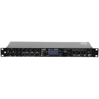 BODY text=#000000 bgColor=#ffffff /nbsp;Affichage : LED et écran rétroéclairé- Alimentation fantôme : Non- Bluetooth : Oui- Catégorie : mixeur multimédia- Couleur : Noir- Dimensions (mm) : 483 x 44,5 x 152- EQ : 2-bandes- Enregistrement : rca- Nombre canaux : 6- Nombre préamplis micro : 2- Poids (kg) : 2,60 kg- Rackable : Oui- Unité rack : 1- Specs complémentaires :- 2 canaux ligne : entrées Rca avec réglage de gain et de niveau- Entrée Aux : 1 entrée minijack 3,5 mm à commutation automatique au branchement d'une source (remplace l’entrée Rca du canal 1)- 2 canaux micro : 2 entrées au format jack 6,35 mm symétrique- Contrôles des entrées micro : gain sur chaque entrée, égalisation 2-bandes partagée, niveau et seuil du talkover- Entrée d'urgence (Emergency) au format Euroblock : désactivation de la diffusion de toutes les sources par la sortie principale lors de la détection d'un signal sur cette entrée, et diffusion du message d'urgence. Niveau du signal d’urgence réglable.- Output Mute : coupure de la sortie principale en court-circuitant les contacts- Réglages avancés via cavaliers sur le PCB : mise en sourdine des micros sur les sorties en cas de signal sur l'entrée Emergency- Sortie principale 1 : stéréo jack TRS symétriques, Rca asymétriques, Eurobloc, avec limiteur de niveau- Sortie principale 2 : stéréo jack TRS symétriques, Rca asymétriques, Eurobloc, avec limiteur de niveau, sommateur, filtre passe haut 100 Hz, et correcteur de tonalité-Contrôle des sorties : volume individuel, égalisation 2-bandes commune- Sortie Enregistrement Rca : identique à Main 1, sans contrôle de volume et d’égalisation- Sortie casque jack 6,35 mm avec contrôle de niveau PFL- Lecteur de médias via port USB en façade : diffusion de musique stockée sur une clé USB- Format supporté : MP3, stocké sur une clé USB de 16 Go maximum, formatage FAT32- Modes de lecture : séquence normale/aléatoire, lecture unique/boucle unique/lecture continue/lecture continue en boucle- Mode jingle : diffusion de jingles momentanés ou programmés, diffusés par-dessus la source principale. Activation manuelle possible via 3 boutons en façade.- Mode FM : diffusion d’une station radio vers les sorties- Mode Bluetooth : diffusion de musique provenant d’un smartphone appairé- Télécommande sans fil incluse- Indicateur de niveau de la sortie principale (avant éventuellement action du limiteur) : 10 LEDs- Bouton Power avec LED d'état